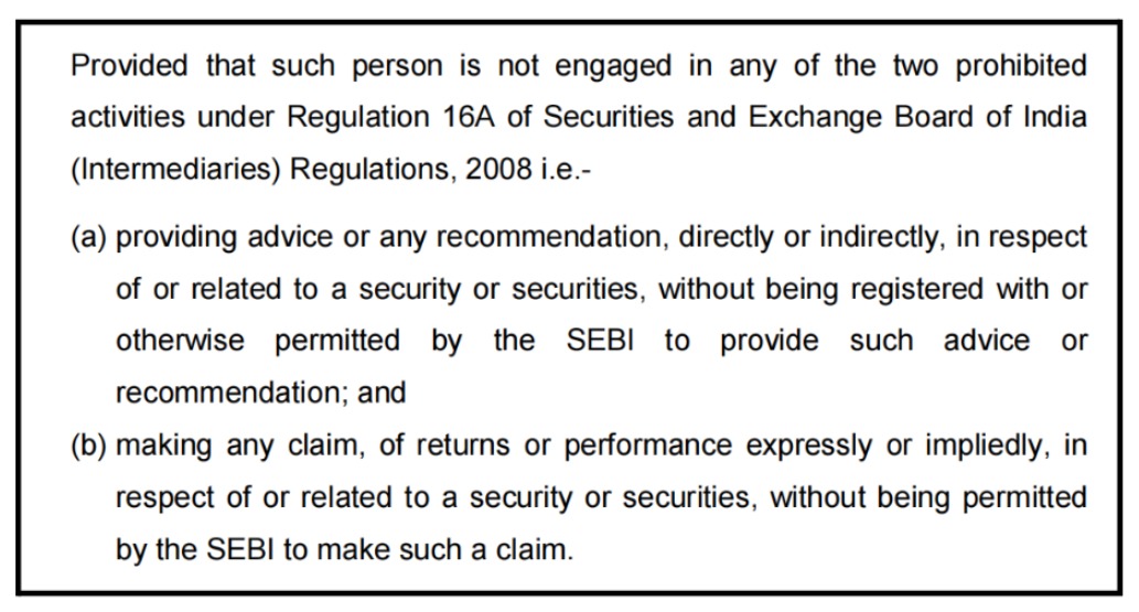 This provision prohibits any person from giving securities advice or making explicit or implied return claims unless they are duly registered and specifically permitted by SEBI.