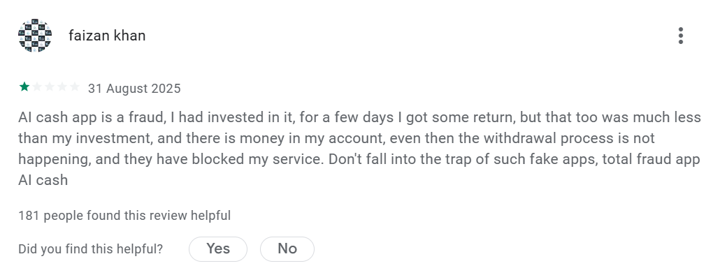 AI Cash App shows all hallmarks of a fraudulent operation. No company transparency. No valid license. No customer support. Countless user complaints about locked funds.