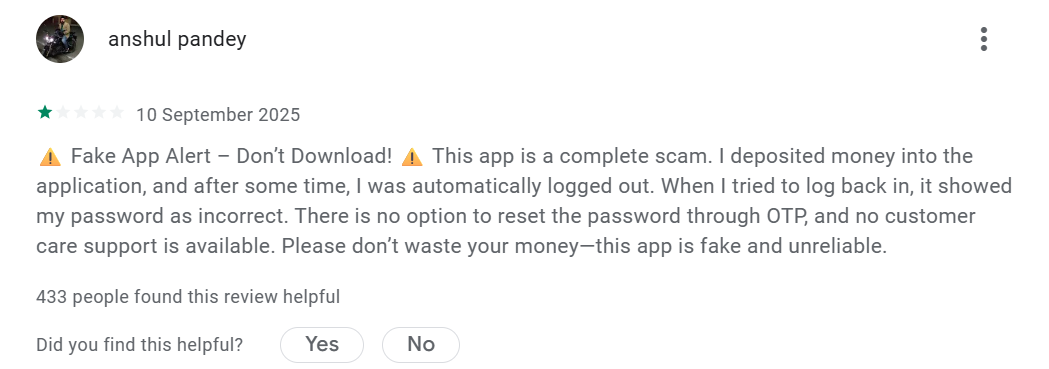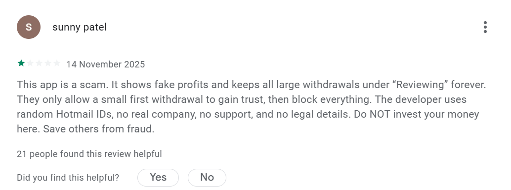 “It shows high profits every day, but when I try to withdraw even ₹100, it stops working. Fake profits only to attract investors.” – Google Play User