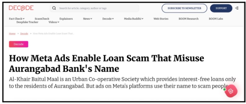 In mid-2024, BoomLive uncovered a large-scale scam running on Facebook and Instagram. The ads claimed to offer interest-free online loans in the name of Al-Khair Baitul Maal, which is a cooperative society based in Aurangabad.