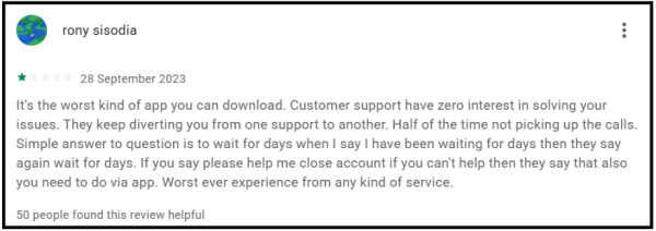 A user left a 1-star review in September 2023 with 50 users marking it as helpful, describing a support system designed to exhaust the investor rather than help them.