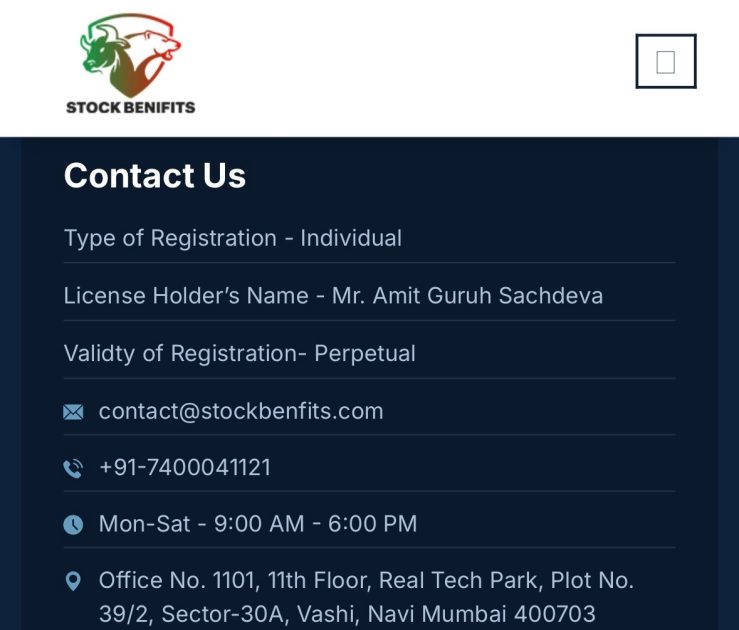 Not only that, the website’s user agreement specifically mentioned: “Amit Guruh Sachdeva (Proprietor STOCK BENEFITS FINANCIAL SERVICES) SEBI Registered Research Analyst No. INH100005190”.