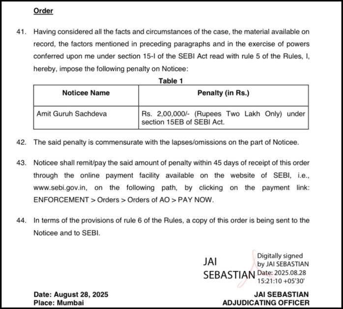 Sachdeva has been directed to pay this amount within 45 days through SEBI’s online penalty payment system.