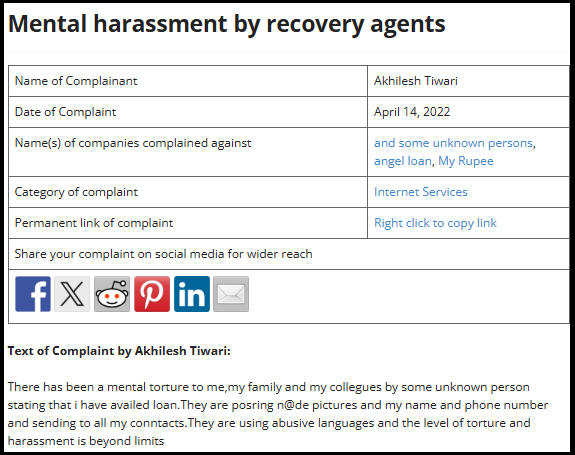 The complainant stated that he, along with his family members and colleagues, was subjected to severe mental harassment by unknown individuals claiming to be recovery agents of Angel Loan.