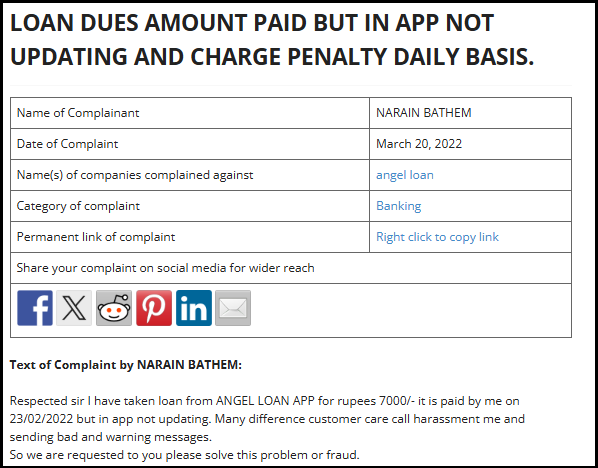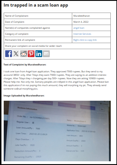 The complainant stated that he took a loan of ₹7,000 from the Angel Loan app and repaid the full amount on February 23, 2022.