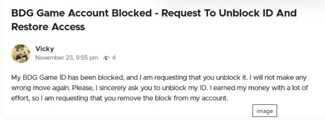 - Another user reported that his BDG Game ID was blocked. He pleaded for the account to be unblocked, explaining that he earned his money with effort and promised not to make any wrong moves again.