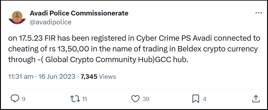 In the tweet, the police state that on 17 May 2023, an FIR (First Information Report) was registered by the Cyber Crime Police Station, Avadi.