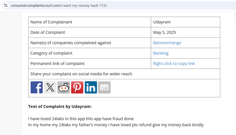 Since Betinexchange is not a legal entity in India, there is no guarantee of a money-back. Moreover, gambling and casinos are also illegal in India. So, there is very little scope to get justice.