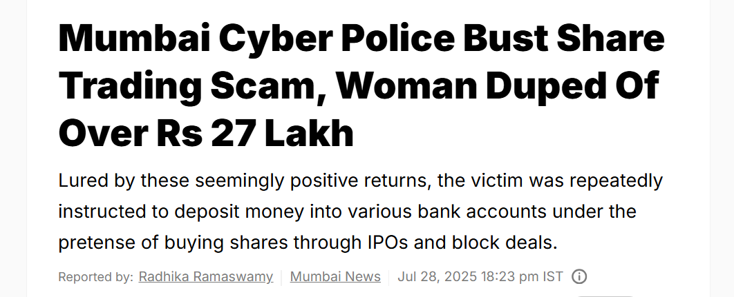 1. Mumbai Block Trading Scam: Last July, a 54-year-old lady was scammed in Mumbai.