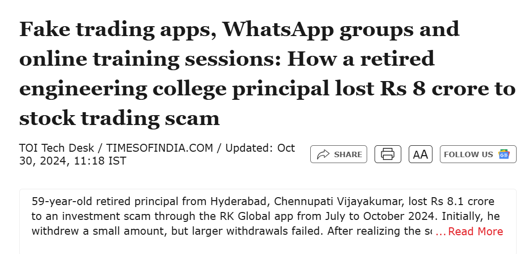 - In total, he lost around ₹12,25,000, with the platform trapping every rupee and the scammers disappearing once he stopped adding funds.
