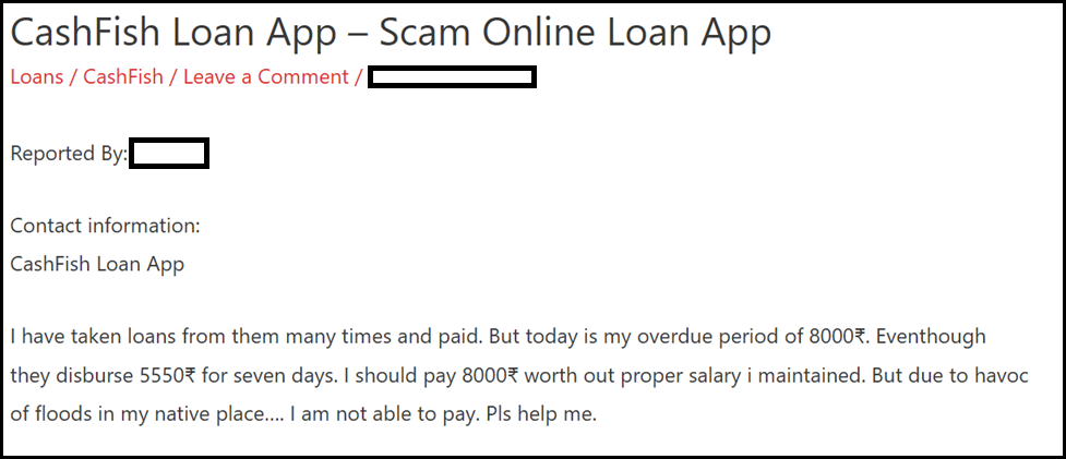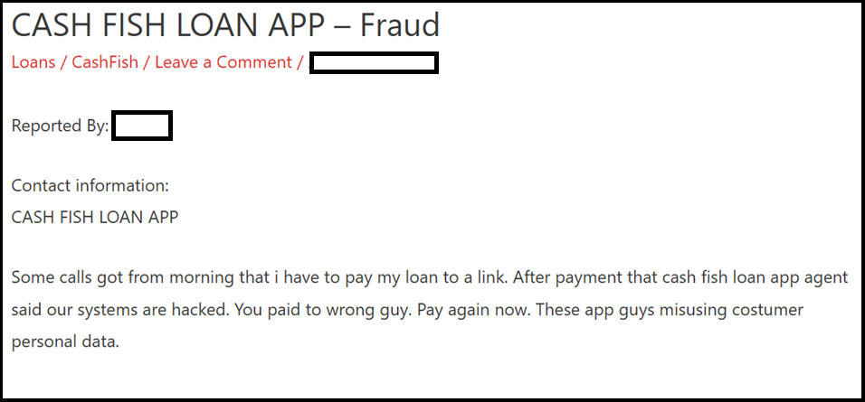 “Some calls got from morning that I have to pay my loan to a link. After payment that cash fish loan app agent said our systems are hacked. You paid to wrong guy. Pay again now.” –