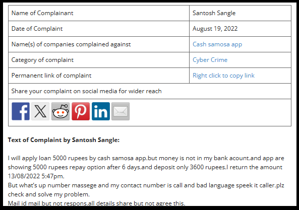 The complainant stated that he applied for a loan of ₹5,000 through the Cash Samosa app.