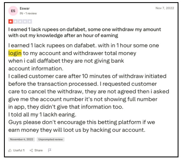 This is one of the serious concerns till now: a user account was logged in by someone else, and their money was withdrawn. This is not how legitimate apps work.
