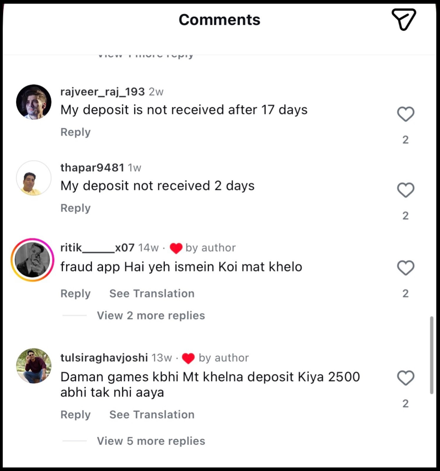 The most prevalent complaint about Daman Games centers on one critical issue, i.e., withdrawals. Users deposit money without any problem, but when they try to withdraw, everything falls apart.