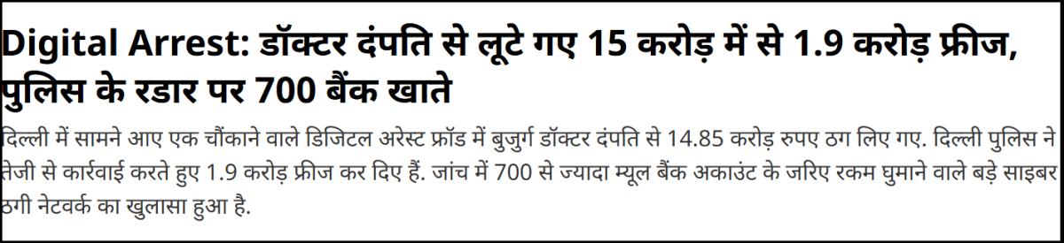 दिल्ली में सामने आए एक बड़े डिजिटल अरेस्ट मामले में साइबर अपराधियों ने एक बुजुर्ग डॉक्टर दंपति को निशाना बनाया।