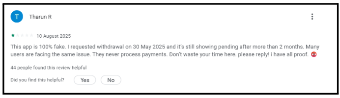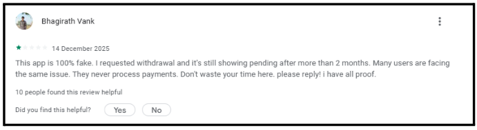 - Perpetual Pending Status – According to user complaint data from the Play Store, over 60% mention withdrawal delays. Some wait 2+ months without receiving payments.