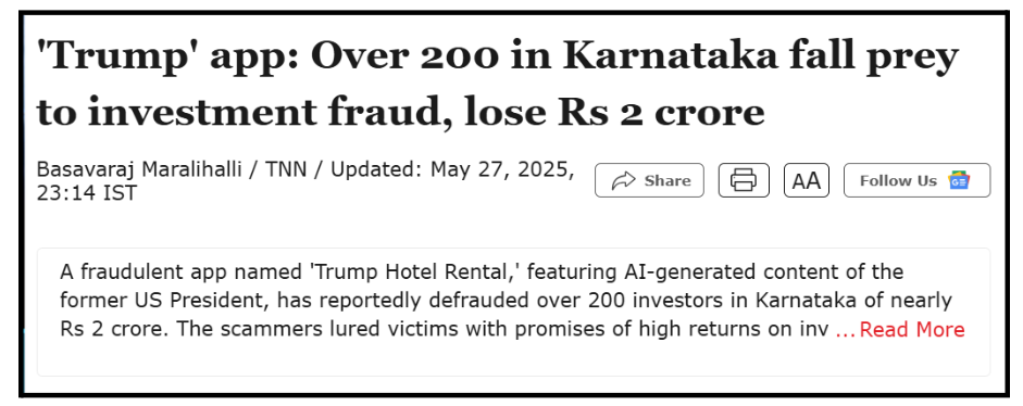 According to news reports, there are multiple incidents of people being duped by AI-linked investment schemes and deepfake-promoted apps in India.