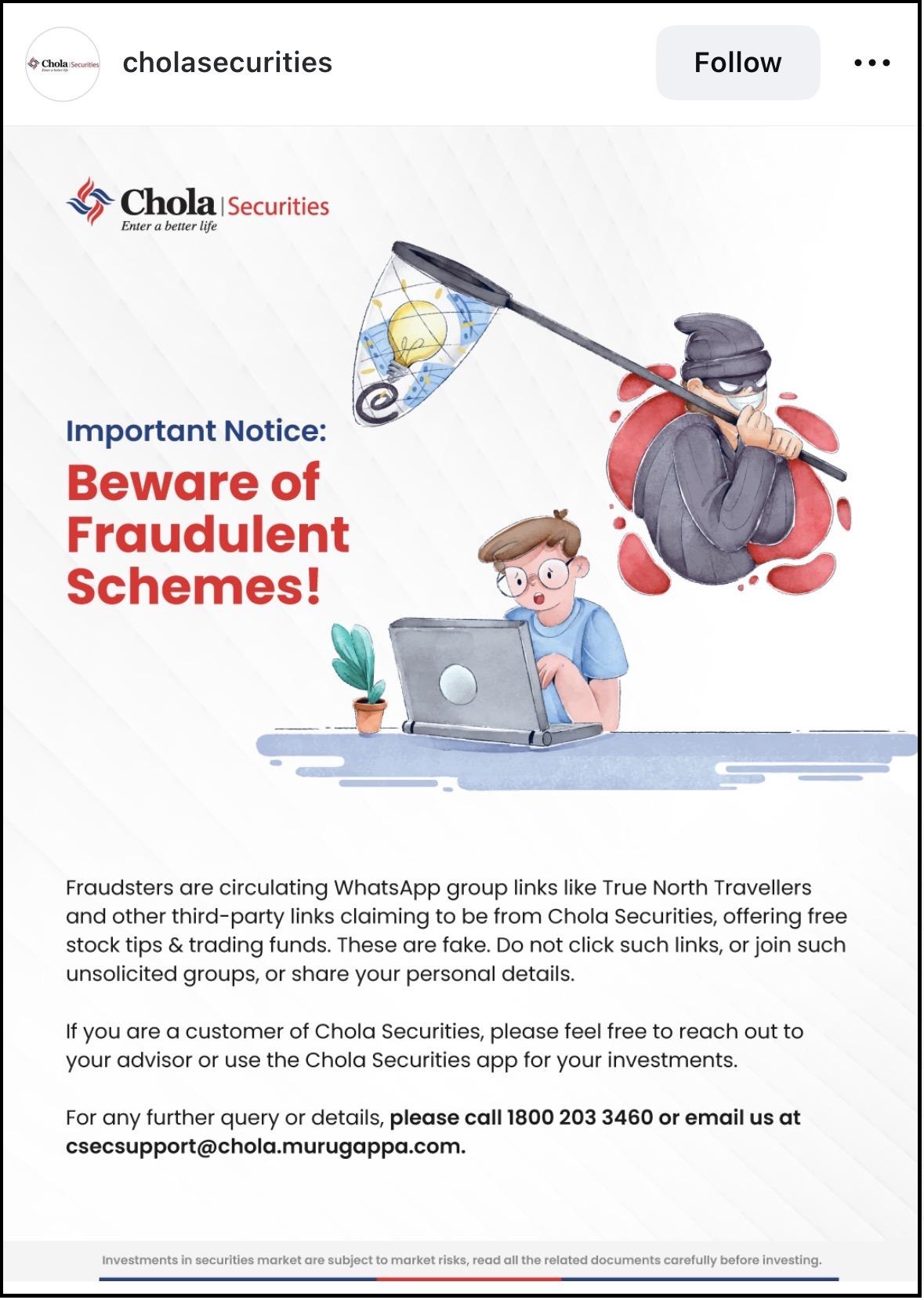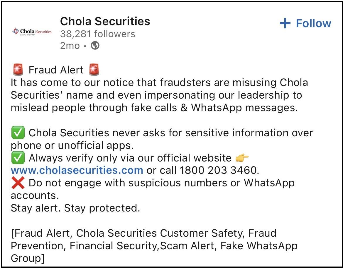 Official warnings and strong alerts have been issued by Chola Securities and Cholamandalam across social media platforms, including Instagram, LinkedIn, and Facebook.