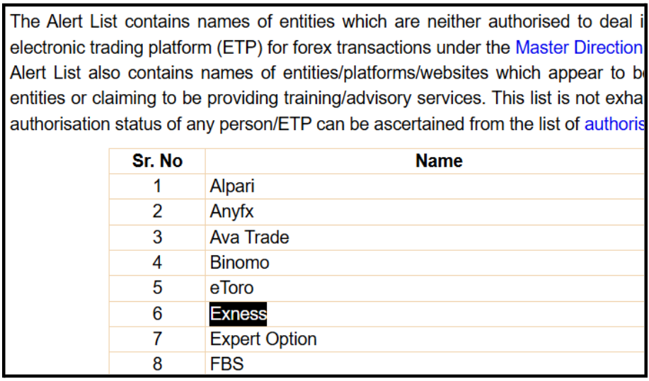Exness is on the RBI Alert List of unauthorized trading platforms. It’s not authorized to operate in India.