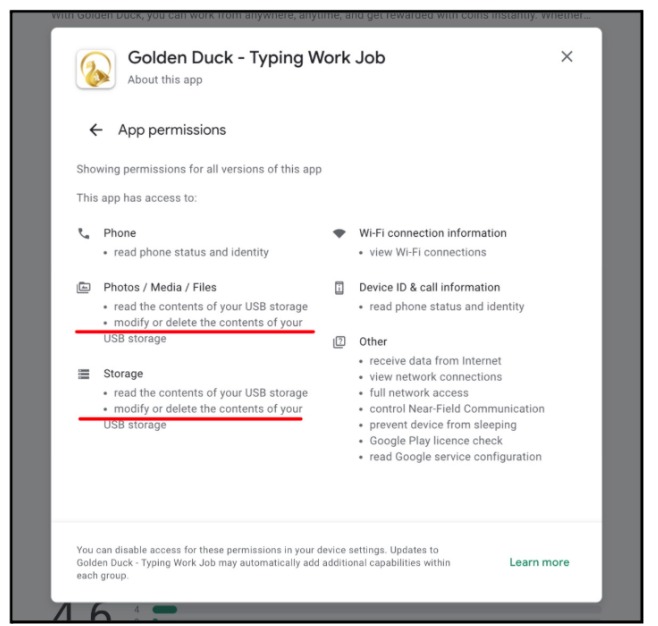 Next, check the storage permissions, where the app can modify or delete the contents of your USB storage. No typing app needs that level of control over your files and photos.