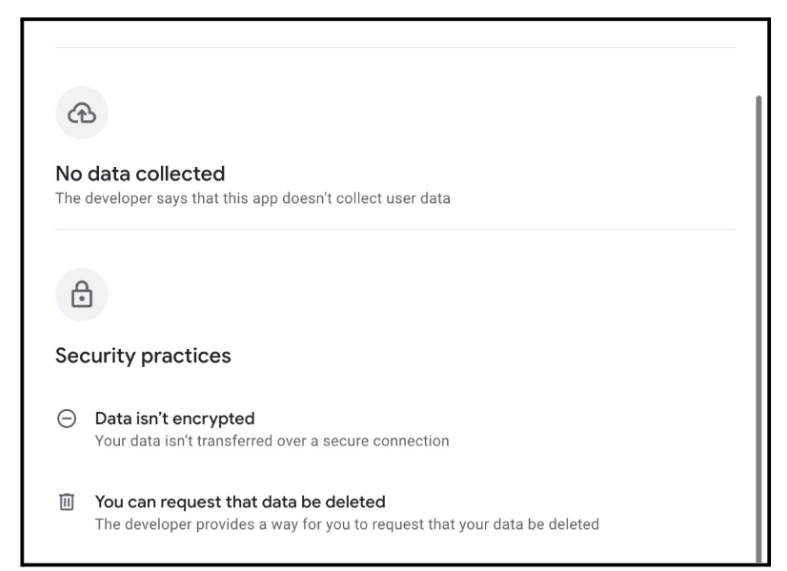First, the app insists it collects no personal data, yet the privacy policy and permissions tell a different story.