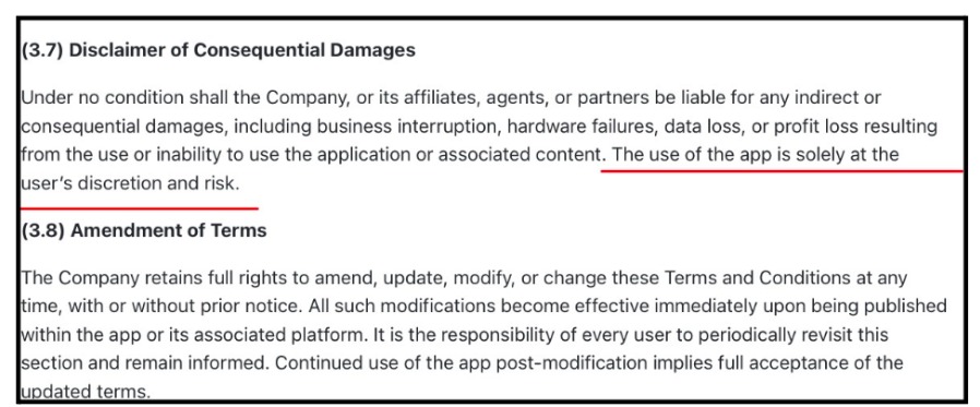 The terms also state that all usage is at your own discretion and risk. Picture this: your account gets banned mid-earnings, or withdrawals fail, and the app shrugs, saying you agreed to it.