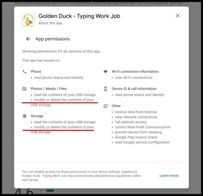 Permissions allow the app to modify or delete USB storage contents, which has no logical tie to typing tasks and could enable unauthorized file access or malware spread.