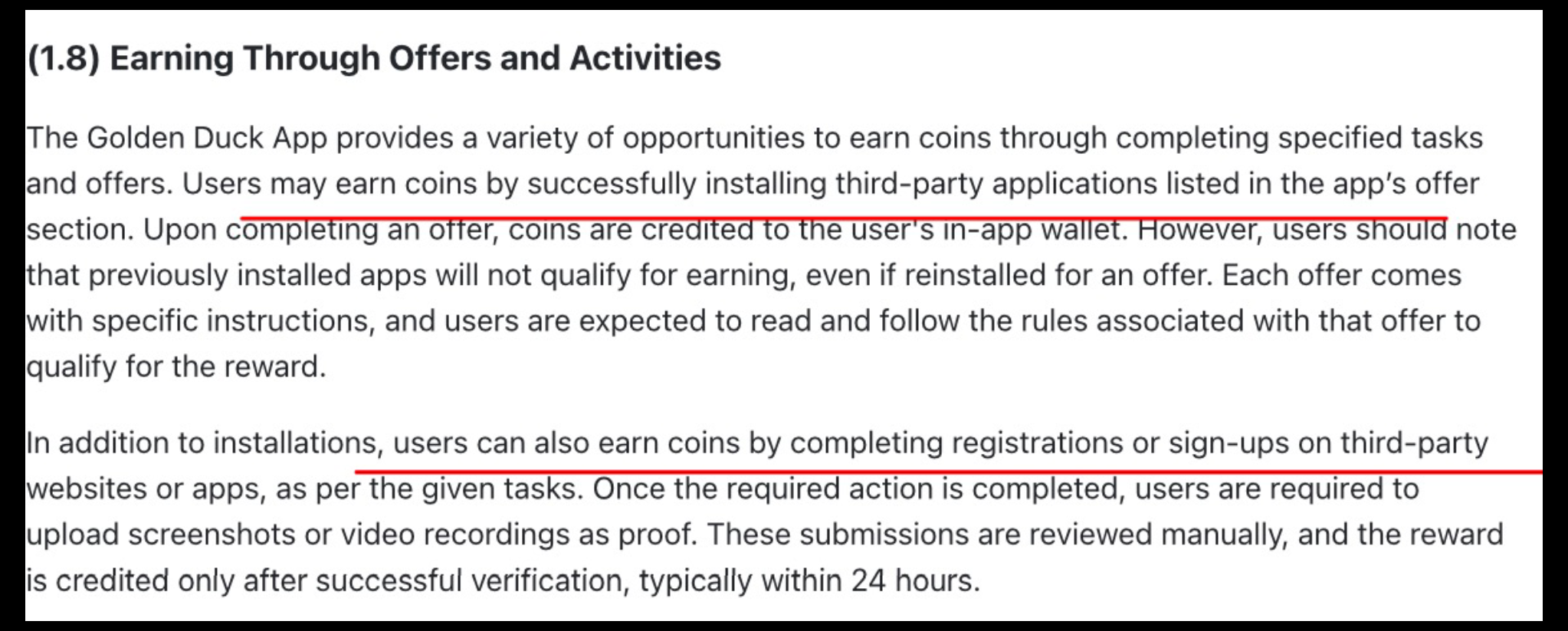 Terms encourage earning via third-party websites through downloads, registrations, or signups, exposing you to fake sites rampant with phishing.