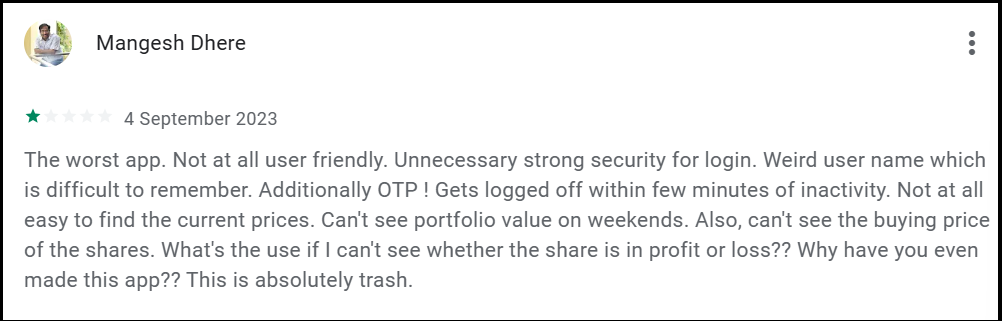 The review highlights confusing login security, frequent OTPs without activity, and missing basic features like portfolio value on weekends, buying price, and a clear profit or loss status.