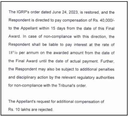That order made the broker pay her Rs. 40,000 as compensation for the delay and hassle, which lasted over four months. No extra penalty beyond this was added, and both sides paid their own costs.