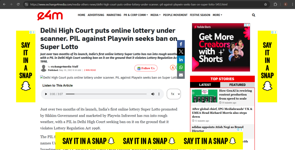 The Delhi High Court examined an online lottery called Super Lottery, which claimed to be connected to the Sikkim Government. A PIL was filed accusing the operators of misleading the public, avoiding the rules of the Lotteries Regulation Act, and marketing the lottery as a “game” to bypass legal scrutiny.