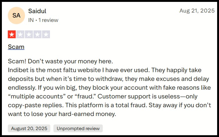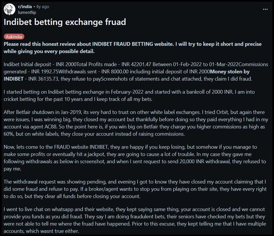 In Reddit discussions, at least one user alleges that after initiating a withdrawal, their account access became restricted and they were unable to complete their Indibet login normally.