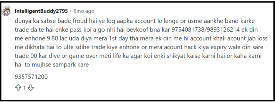 - User IntelligentBuddy2795 lost ₹9.8 lakh in one day after giving account access and claims trades were placed blindly on expiry day.
