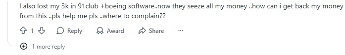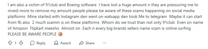- Another user shared that he lost ₹3,000 to 91Club and Boeing software, after which the platform allegedly locked all their remaining funds.