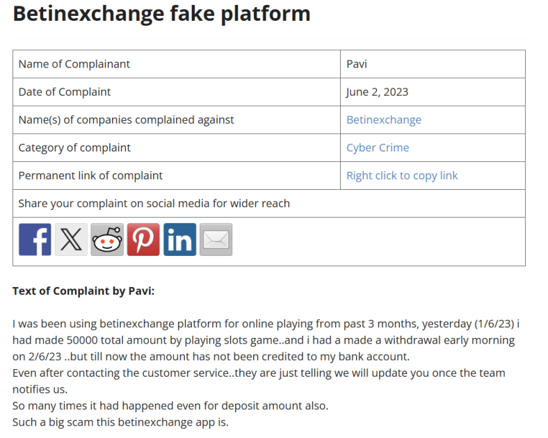On ConsumerComplaintsCourt.com, a user named Pavi claims she made ₹50,000 through BetInExchange and requested a withdrawal, but the amount never hit their bank account.