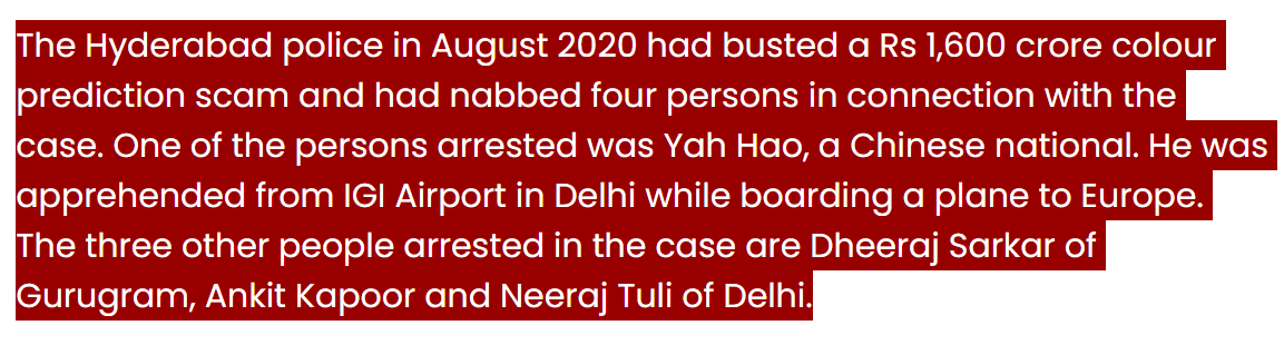 - In 2020, Hyderabad police uncovered a massive ₹1,600-crore colour prediction scam.