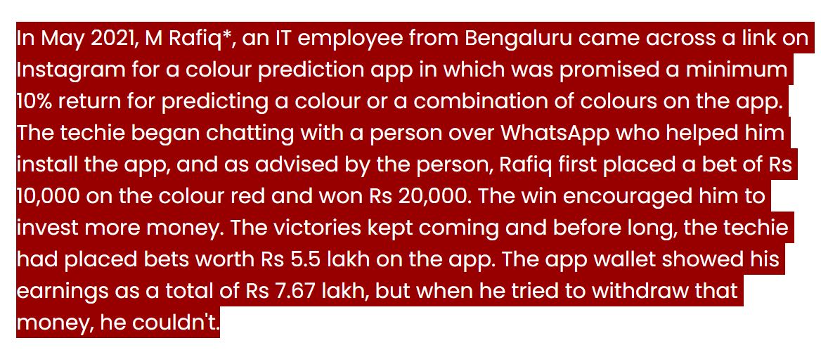 - Found an Instagram link promoting a colour-prediction app with “10% guaranteed returns.”