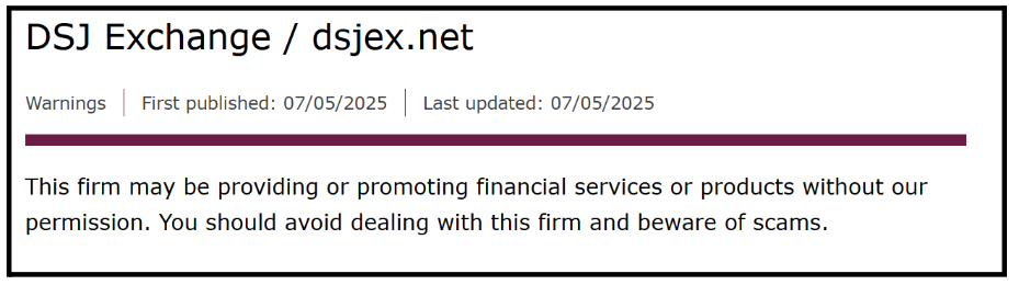 UK Financial Conduct Authority (FCA) – On May 7, 2025, the FCA officially blacklisted DSJ Exchange.