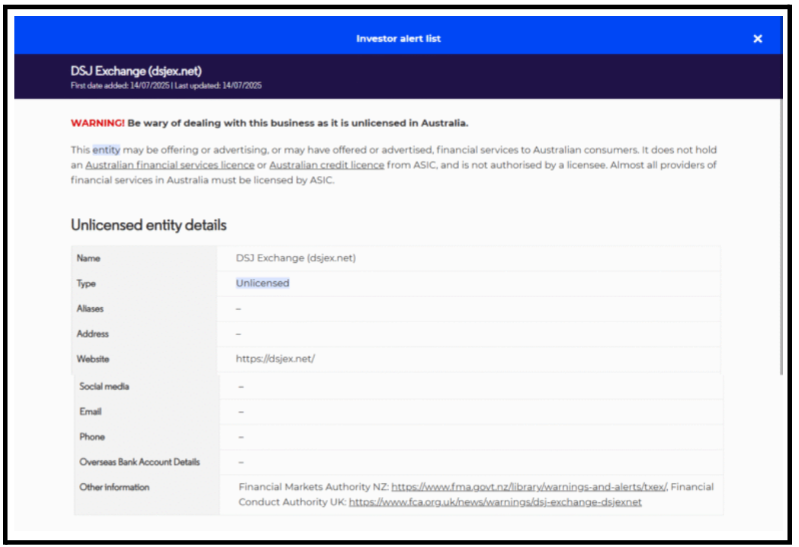 - ASIC License Claim: DSJ Exchange fraudulently displays fake ASIC licensing credentials on their website, while Australia’s official regulator has blacklisted them as an unlicensed entity operating illegally.