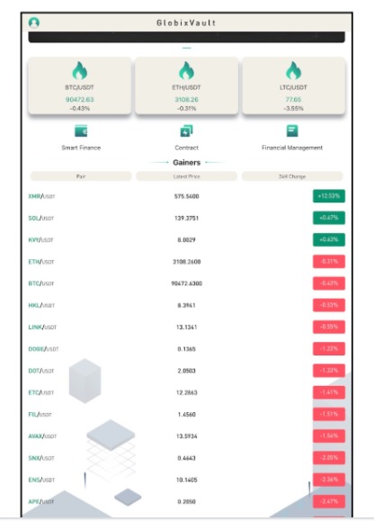Globixvault markets itself as a sleek forex and crypto trading platform, flashing charts of pairs with flashy “gainers” and price updates. The homepage lures users into signing up for trades promising quick profits.