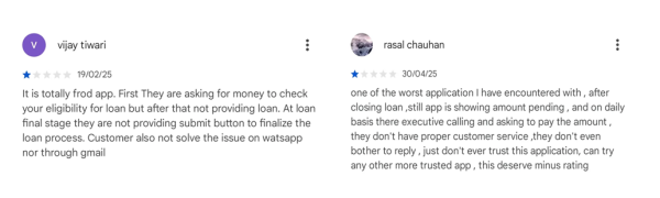 Dozens of users have also complained about advance fee scams, where they were asked to pay small amounts (like a “processing fee” or “first EMI”) before receiving the loan.