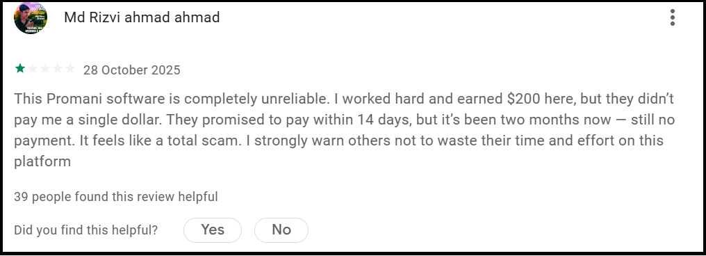 “This Promani software is completely unreliable. I worked hard and earned 1600rs. Here, but they didn’t pay me a single rupee. They promised to pay within 14 days, but it’s been two months now, still no payment”.