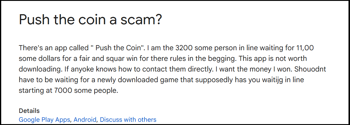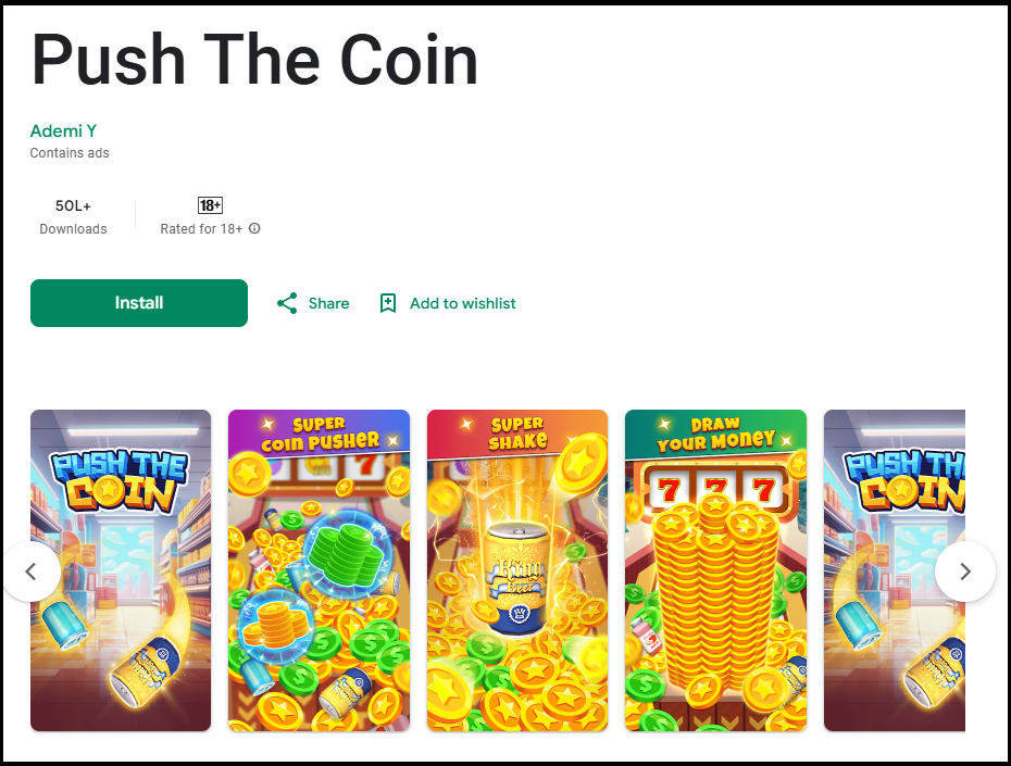 Apps like push the coin are only developed to waste your time so that they can generate revenue by the ads you watch. If you see an app like this, scroll past it. Your time, privacy and peace of mind are worth more than some money.