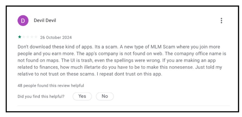 People have also noticed that this app has no web presence, no office on maps, poor grammar, and an MLM (referral) structure. This seems more like a fly-by-night scam. Real financial institutions spend millions on professional interfaces.