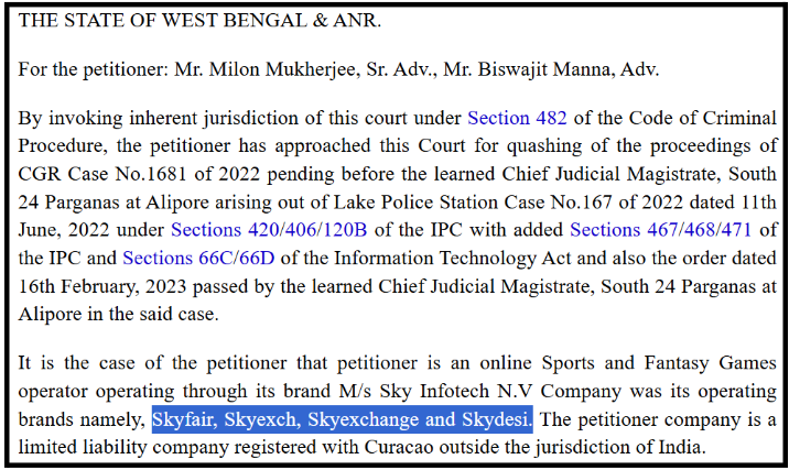 According to Indian Kanoon court records, on February 16, 2023, investigating officers requested court direction to block SkyExchange websites.