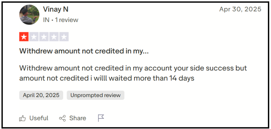 Vinay’s withdrawal showed success on their end. The bank account never received money. Waited 14+ days. Still nothing.