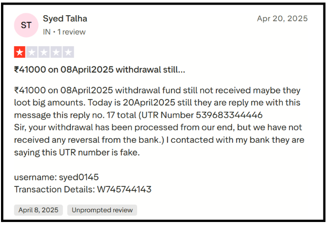 Syed requested a ₹41,000 withdrawal on April 8. Still not received by April 20. They sent the same message 17 times. The bank confirmed UTR is fake.