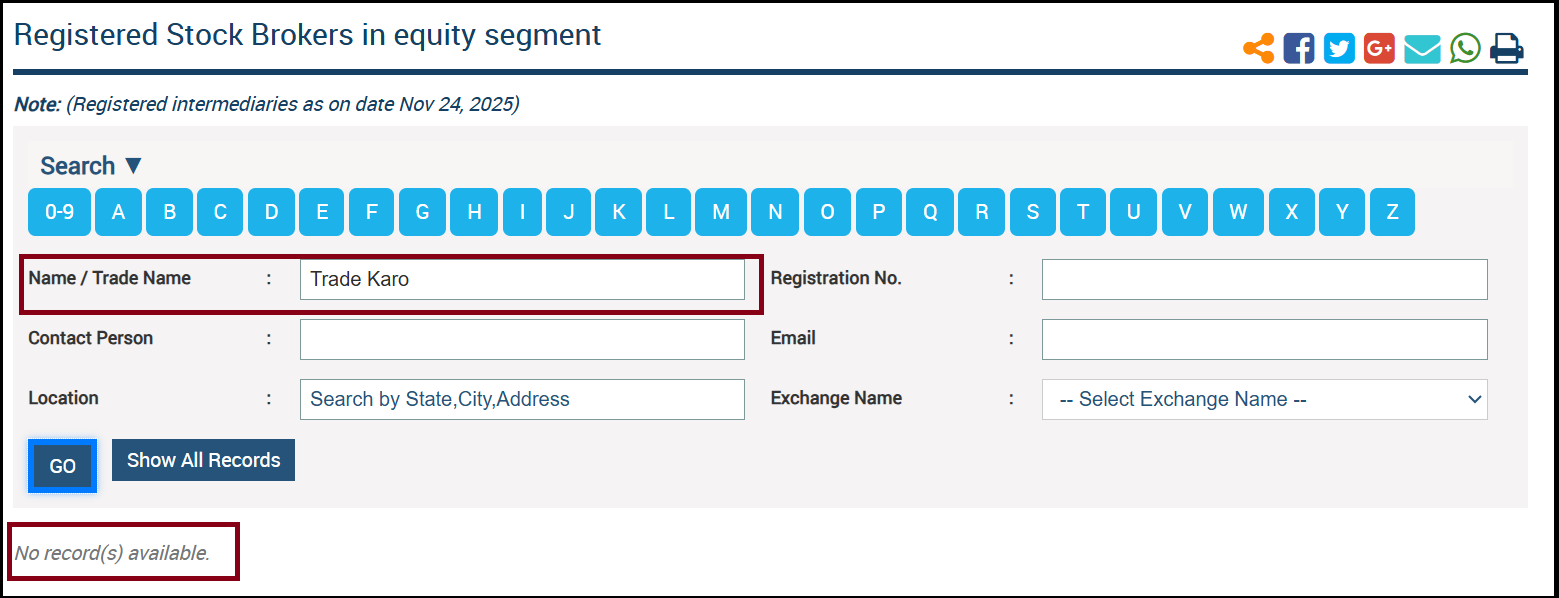 To verify the same, if you search for the broker on SEBI website, this is what you get: