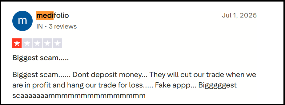 User Complaint: A Trustpilot reviewer named “medifolio” reported: “Biggest scam…… Don’t deposit money… They will cut our trade when we are in profit and hang our trade for loss….. Fake app”