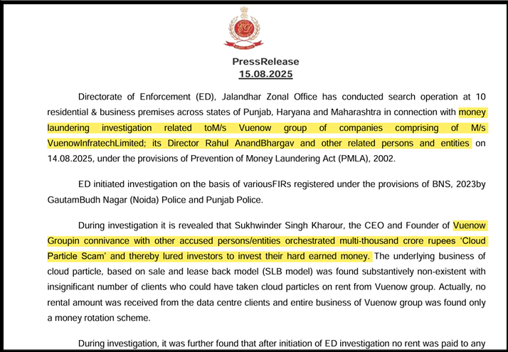 In 2023–2024, the ED began investigating Vuenow. ED claims the company collected over ₹2,000–3,000 crore from investors.